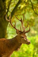 Edelhert in een bos tijdens de vroege herfst aan het begin van het bronstseizoen. Het hert heeft een gewei op zijn kop.