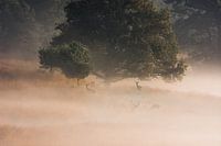 Een Edelhert met een groep hindes op de Elsberg (Veluwe). De ochtendmist op het vergeelde gras in de herfst maakt het een sfeervol beeld.