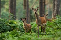 Edelhert met jong in boslandschap met varens