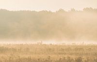 Een sfeerbeeld van een edelhert met zijn harem tijdens de bronsttijd. Het tafereel speelt zich af tijdens het gouden uur terwijl het nevelig is en de herfst zijn intrede doet. Het natuurgebied ligt in de provincie Limburg in Nederland en wordt beheerd door Het Limburgs Landschap.