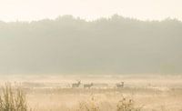 Een sfeerbeeld van een edelhert met zijn harem tijdens de bronsttijd. Het tafereel speelt zich af tijdens het gouden uur terwijl het nevelig is en de herfst zijn intrede doet. Het natuurgebied ligt in de provincie Limburg in Nederland en wordt beheerd door Het Limburgs Landschap.