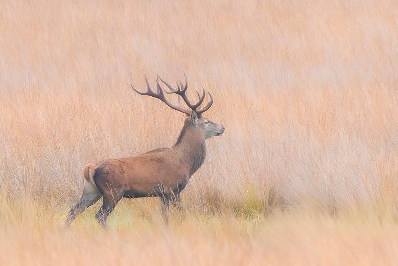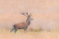 Edelhert op de Veluwe, mooi in het hoge gras te zien. De foto is gemaakt in park de Hoge Veluwe. De sfeer is een warm beeld, met mannelijke kracht er in.