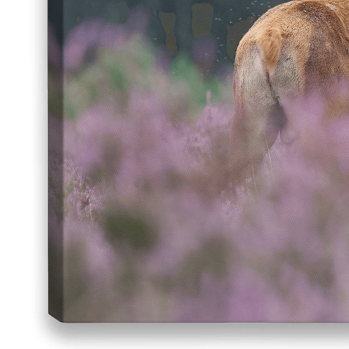 Edelhert tussen de paarse Heide op het park de Hoge Veluwe.