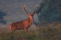 Een edelhert staat in het ochtendzonnetje op de veluwe