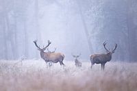 Op een mooie middag stonden deze edelherten in de mist. Het landschap zat nog onder de rijp