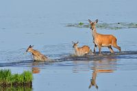 Edelherten die een meer oversteken.