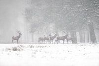 een groep mannetjes edelherten in de sneeuw op nationaal park de hoge veluwe in Nederland. Sneeuwbui in de winter. Herten in de sneeuw.