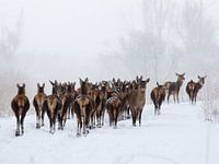 Deze groep edelherten, allemaal hindes, moet de strenge winter overleven in de Oostvaardersplassen. Ze worden niet bijgevoerd, dus moeten zichzelf in leven zien te houden. Dat valt niet mee in deze barre omstandigheden, maar toch levert het een sfeervolle plaat op.