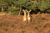 Twee prachtige edelherten wandelend door de heide op de Veluwe.