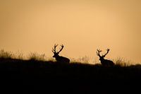 Edelherten op de Veluwe bij ondergaande zon.