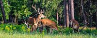 Edelherten in de vroege vooravond. Foto gemaakt op het "Park de Hoge Veluwe". Duidelijk is te zien dat de bast (huid) nog op het Gewei zit. Gefotografeerd tijdens een rustig moment.