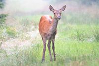 Een jong edelhert tijdens het fourageren waant zich onbespied. De fotograaf zit echter goed verstopt op slechts enkele meters.