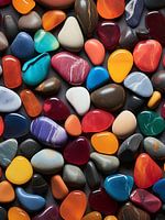 Deze foto toont een verscheidenheid aan glanzende stenen in verschillende kleuren en vormen, gerangschikt in een zeer kleine ruimte. De stenen variëren van rijk geel en rood tot diep blauw en grijs, wat een indrukwekkende variatie en textuur oplevert. Het glanzende, bijna gepolijste effect op sommige stenen versterkt de visuele aantrekkingskracht, terwijl de onregelmatige vormen de natuurlijke charme van de stenen benadrukken. De compositie is harmonieus en trekt de aandacht met zijn krachtige kleuren en verschillende oppervlakken en afmetingen.