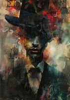 Details: mannenportret, kostuum, hoed, zwart, rood, blauw, mysterieus, duister, abstract, expressief