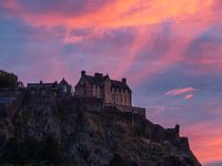 Edinburgh Castle torent boven de Schotse hoofdstad uit terwijl de avondlucht explodeert in tinten roze, oranje en paars. Het kasteel, gebouwd op een uitgedoofde vulkaan, dateert uit de 12e eeuw en is een van de meest bezochte bezienswaardigheden van Schotland. Deze foto toont de iconische skyline van Edinburgh onder een dramatische zonsondergang.