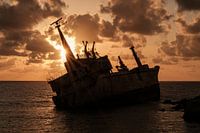 Beleef de magie van een onvergetelijke zonsondergang aan de kust van Peyia, Cyprus, met deze indrukwekkende kleurenfoto van het EDRO III scheepswrak. Het schip, dat sinds 2011 op deze plek is gestrand, wordt in dit beeld omgetoverd tot een mysterieus silhouet tegen de warme, gouden gloed van de ondergaande zon. De lucht verandert van oranje en roze naar diep paars, terwijl de zee het licht weerspiegelt en de scène een serene sfeer geeft.