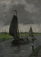Boten of schepen varen door een kanaal op de wind met hun zeil in de mast. De wolken zijn onheilspellend donker.