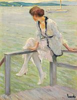 Een jonge vrouw zit in een jurk in wit aan de rand van het water.