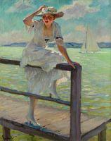 Een jonge vrouw zit in een jurk in wit aan de rand van het water.