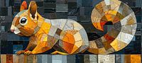 Eekhoorn Beeld | Eekhoorn in Oranje en Bruin - Op dit schilderij zie je een eekhoorn, met een kleurrijke en moderne stijl, die uit verschillende geometrische vormen is opgebouwd, waarbij vooral de oranje en bruine tinten opvallen tegen een donkere achtergrond.