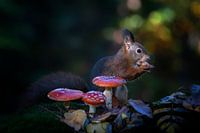 Hongerige eekhoorn eet een hazelnoot in een herfstbos in Nederland met paddenstoelen en bladeren. Vliegenzwam, rood met witte stippen. Bokeh achtergrond.