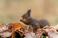 Eekhoorn eet een walnoot in een bos met herfstbladeren als ondergrond.