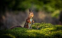 Eekhoorn in het mos aan de rand van een verscholen bosvijver midden in het bos.