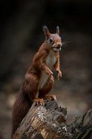 Foto van een rode eekhoorn die een nootje in zijn bek heeft en deze gaat verstoppen.