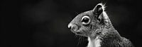 In het midden van een zwart-witte panorama foto, staat een eekhoorn rechts, scherp ingezoomd. Zijn nieuwsgierige blik kijkt naar links, zichtbaar in al zijn fijne details. De achtergrond is diep zwart, waardoor het contrast met de eekhoorn extra opvallend is. Deze minimalistische compositie brengt de schoonheid van eenvoud naar voren,…