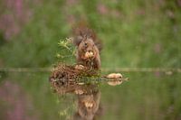 Eekhoorn op een klein eilandje in het water, met reflectie