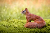 Deze prachtige eekhoorn kwam ik tegen in het bos. Hij nam even plaats op het mos. Hij zat daar om zich heen te kijken. Het beeld heeft een prachtige achtergrond in hele mooie bijpassende kleuren