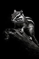 Een energieke eekhoorn neergestreken op een verweerd stuk hout straalt een fascinerende verandering van omgeving uit. De monochrome afbeelding benadrukt de levendige strepen en fijne details van de vacht. Ideaal voor de woonkamer, brengt het een vleugje natuur en levendigheid die elke bezoeker zal verbazen.