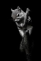 Een delicate eekhoorn in zwart-wit, mysterieus slingerend op een tak. De contrasten tussen licht en schaduw benadrukken zijn nieuwsgierige uitdrukking en de fijne details van zijn vacht. Dit artistieke werk brengt een charmante nabijheid tot de natuur en een zekere speelsheid in elke woonkamer, ideaal voor dierenliefhebbers en natuurfanaten.