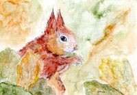 Deze aquarel toont in delicate kleuren een charmante eekhoorn in het gebladerte