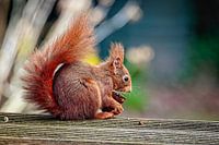 Eekhoorn op de hardhouten planken van de trap in de eigen tuin.