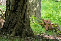 Een eekhoorn met jong kijken gespannen naar eenzelfde kant; is de kust nog wel veilig?