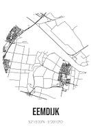 Zwart-witte landkaart, stratenplan of plattegrond van Eemdijk. Eemdijk is gelegen in de gemeente Bunschoten, provincie Utrecht. Op de stadskaart zijn alle openbare wegen in Eemdijk opgenomen. Verder is de kaart voorzien van de coördinaten van het centrum van Eemdijk.