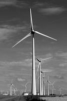 Zomergezicht op het landschap en de multi-fuel centrale met windturbines in de Eemshaven, in Groningen, Nederland. Zwart-wit windmolenpark alternatieve energie.