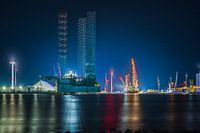 Nachtelijke opname van de Eemshaven. Boorplatform Gabrus en windmolenbouwer Blue Tern zijn prominent in beeld. Het licht dat onder het platform door schijnt komt van het cruiseschip Disney Wish.