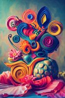 Kleur, vorm en textuur komen samen in dit expressieve stilleven dat de grenzen tussen abstractie en realisme doet vervagen. Dit werk is een explosie van levendige tinten en speelse composities, geïnspireerd door de huidige interieurtrends waarin kleur en abstractie een centrale rol spelen. De dynamische vormen en subtiele details nodigen de kijker uit om steeds opnieuw iets nieuws te ontdekken.