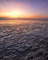 Ervaar de serene schoonheid van de Waddenzee met deze betoverende foto van een zonsondergang tijdens eb. Het unieke landschap, waar land en zee samenkomen, wordt gevangen in een moment van pure magie. De warme, oranje tinten van de ondergaande zon mengen zich harmonieus met de koele blauw- en paarstinten van de lucht, terwijl het getij de bodem van de zee blootlegt.