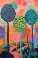 Dit werk neemt je mee naar een kleurrijke fantasiewereld waarin bomen en struiken in de meest onverwachte tinten oplichten tegen een warme achtergrond. De gelaagde patronen en speelse stippen creëren een dromerig, bijna surrealistisch boslandschap waar je oog telkens iets nieuws ontdekt. De kleuren lijken met elkaar te dansen, alsof het…