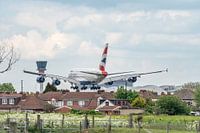 Een British Airways A380 (G-XLEL) landt op London Heathrow Airport.