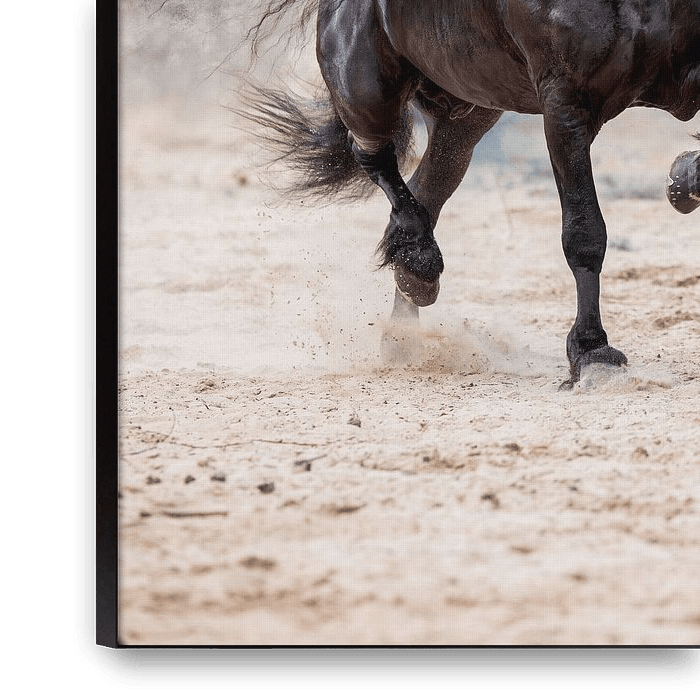 Een Friese hengst in draf over de zandvlakte. Zijn krachtige bewegingen en trotse houding laten zien waarom dit ras zo bijzonder is. Naast hun indrukwekkende uitstraling hebben Friese paarden een zacht en trouw karakter. In dit beeld komen zowel de kracht als de schoonheid van dit paard samen.