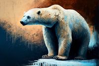 Een digitaal geschilderd portret van een IJsbeer op een ijsschots. Het kleurpalet en de rauwe stijl van dit werk is geïnspireerd door roestig metaal. Dit kleurenpalet gecombineerd met de verf spetters creëeren een grungy en mysterieuze look. Het werk geeft dan ook een moderne industriële look aan uw interieur!