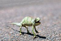 Een kleine lichtgroene Kameleon (Chamaeleonidae) steekt een geasfalteerde straat over. De foto is gemaakt in het binnenland van Zambia, in het jaar 2011.