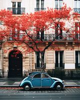 Boven de auto torent een prachtige boom met levendige rode herfstbladeren, die een opvallend kleurcontrast vormen met de diepblauwe kleur van de auto. De klassieke architectuur op de achtergrond,…