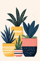 Een stijlvolle, moderne illustratie van verschillende kamerplanten in geometrische potten. De compositie toont een harmonieus samenspel van warme gele, zachte roze en diepe marineblauw gekleurde plantenpotten, gevuld met gestileerde tropische bladeren in verschillende groentinten. Het minimalistische ontwerp met subtiele texturen en gestippelde details creëert een eigentijdse, rustgevende sfeer.