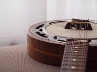 Een 60 jaar oude Mandoline Banjo. Het instrument is voorzien van misschien wel 40- 50 jaar oude snaren.