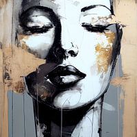 Een unieke en intrigerende creatie Het gezicht van een mooie, jonge vrouw, gehuld grijs, beige en goudtinten. Een mysterieuze sfeer geeft. De verrassende combinatie van grote, grove, penseelstreken in combinatie met subtiele lijnen maken dat het doek een ruwe schoonheid uitstraalt. Het schilderij lijkt te ademen en neemt de kijker mee in de emoties die het uitstraalt. Dit kunstwerk nodigt uit tot contemplatie en reflectie. Een opvallend en interessant statement in elke ruimte waar het hangt.